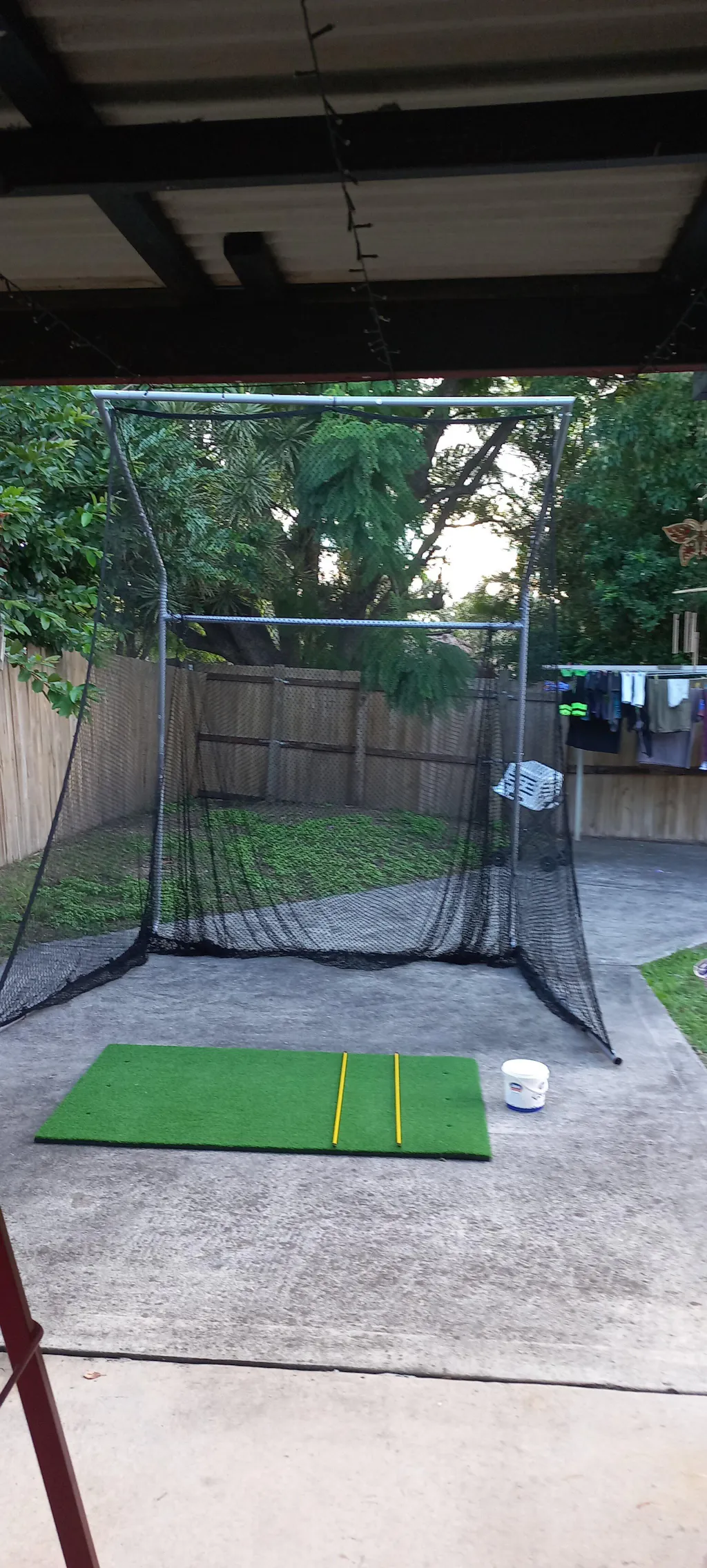 This has been a great addition to our backyard and gets used continuously by my kids and their friends (and me) and has allowed my boys to rapidly improve their golf. Assembly was pretty straightforward but does require 2 people and a ladder. I added a 20kg gazebo sandbag to each corner for safety and it has withstood major wind events without issue. The baffle net is great, you can clearly see where the ball has hit the net after each shot so it gives great feedback. Add a launch monitor and you have the perfect backyard setup. Very happy with this product.